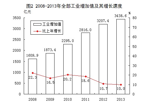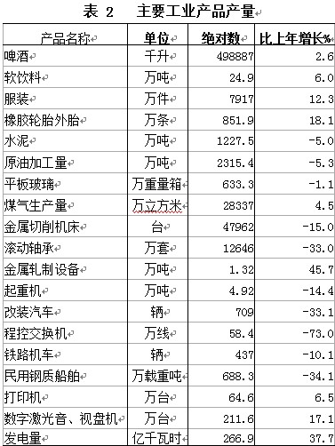 工业生产:全年全部工业增加值3438.6亿元,比上年增长10.0%。规模以上工业(下同)增加值【2】3243.5亿元,比上年增长10.2%。按轻重工业分,重工业2382.1亿元,增长9.9%;轻工业861.4亿元,增长11%。按经济类型分,国有控股工业672亿元,下降1.3%;民营控股工业2023.6亿元,增长18.8%;外商控股工业548亿元,下降0.9%。销售产值11230.7亿元,比上年增长10.6%。工业产品销售率95.9%,比上年下降0.81个百分点。主营业务收入10819.1亿元,比上年增长9.7%;利税总额920.4亿元,增长6.6%;利润总额446.5亿元,增长26.1%。主要工业产品产量有升有降(见表2)。