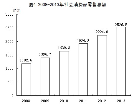 消费品市场:全年社会消费品零售总额2526.5亿元,比上年增长13.6%。其中,批发业零售额289.3亿元,增长17.7%;零售业零售额1988.7亿元,增长13.6%;住宿业零售额31.9亿元,增长2%;餐饮业零售额216.6亿元,增长10.6%。在限额以上批发和零售业零售额中,金银珠宝类增长12.4%,服装、鞋帽、针纺织品类增长9.8%,通讯器材类增长25.3%,家具类增长9.6%,石油及制品类增长26.3%。销售汽车18万辆,销售额301.3亿元,分别比上年增长6.8%和5.1%。其中新车12.6万辆,销售额248.1亿元,分别增长4%和2.8%。
