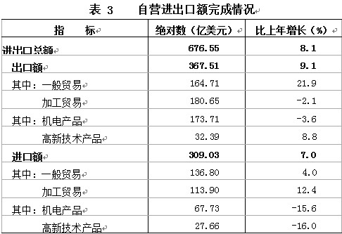 对外贸易:全年大连地区(含中央、省公司)进出口总额688.23亿美元,比上年增长7.3%。其中,进口313.85亿美元,增长6.6%;出口374.37亿美元,增长7.9%。大连市自营进出口总额(下同)676.55亿美元,比上年增长8.1%。其中,进口309.03亿美元,增长7.0%;出口367.51亿美元,增长9.1%。机电产品出口173.71亿美元,下降3.6%,占47.3%。一般贸易出口164.71亿美元,增长21.9%,占44.8%(见表3)。民营企业出口148.07亿美元,增长40.6%,占40.3%。日本、东盟、欧盟、美国、韩国、香港是六大主要出口市场。