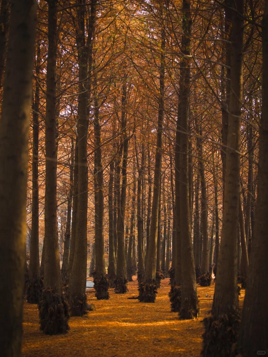 秋季踏入水杉森林,仿佛进入了一个梦幻般的世界。阳光透过枝叶的缝隙洒下,像一道道金色的光束。