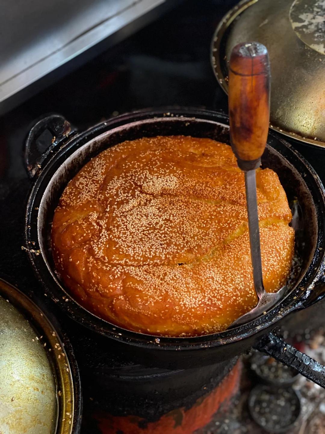 开锅的时候,就沿着锅壁倒入油水。等朝上一面凝固之后,再将烧饼翻身朝下,再次倒入油水,香气扑鼻而来。