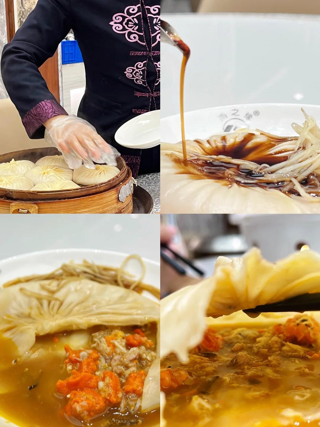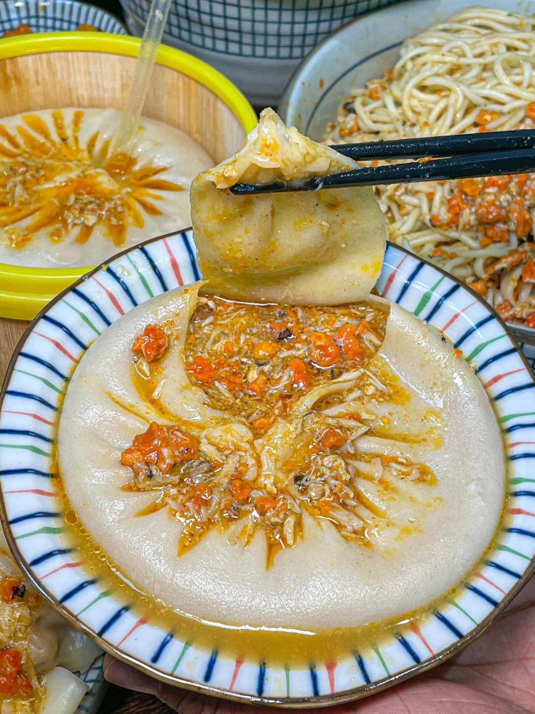 鲜美蟹黄和蟹肉“吸着吃”,面皮韧可吹气球,好像是在吃一碗海鲜粥,一口鲜掉“打头”。