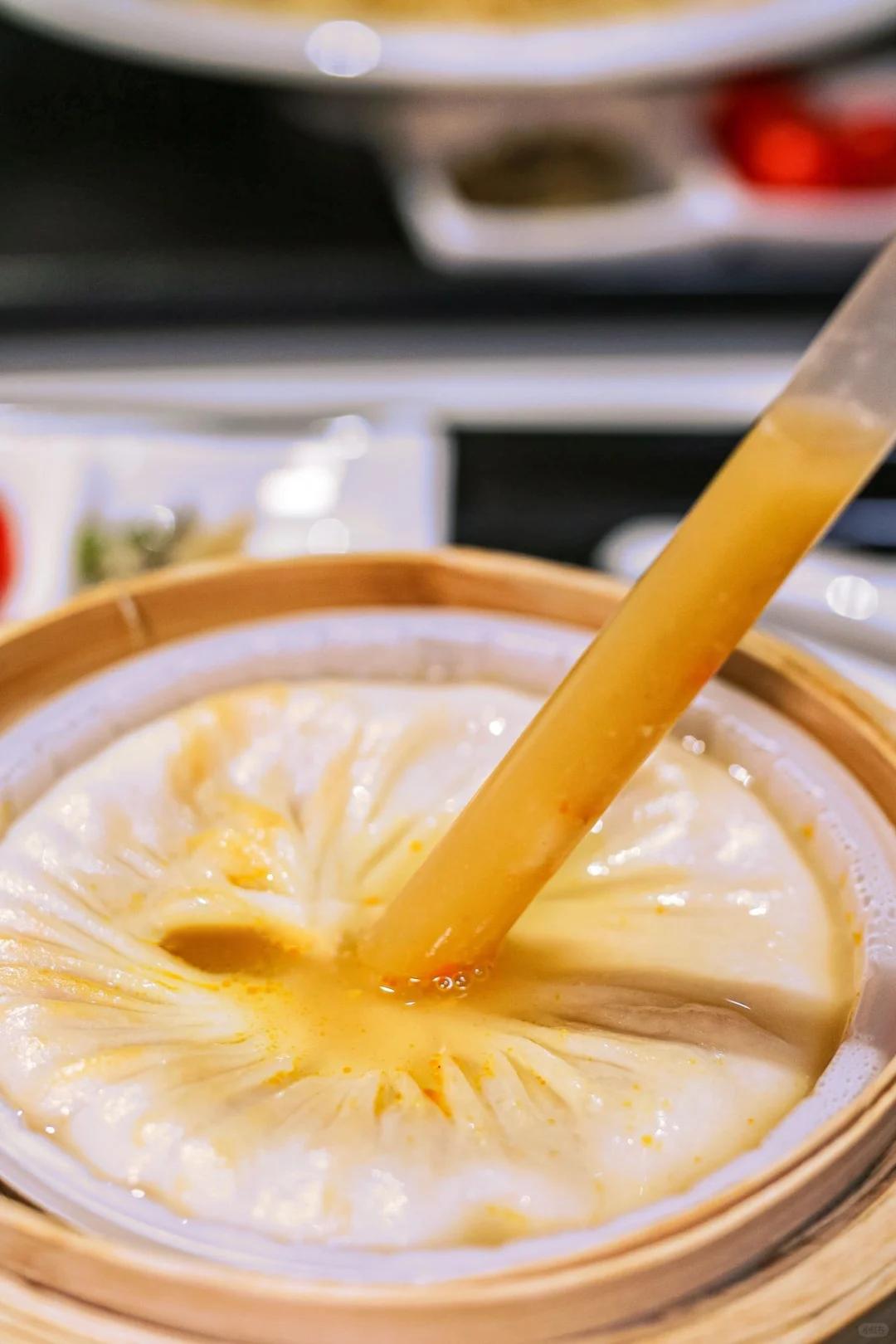 将面皮轻轻咬开一个小口,蟹黄就如泉水般涌了出来,一下子充斥在整个盘子里。直接就拿吸管吸,蟹黄的鲜味瞬间爆在口腔里。