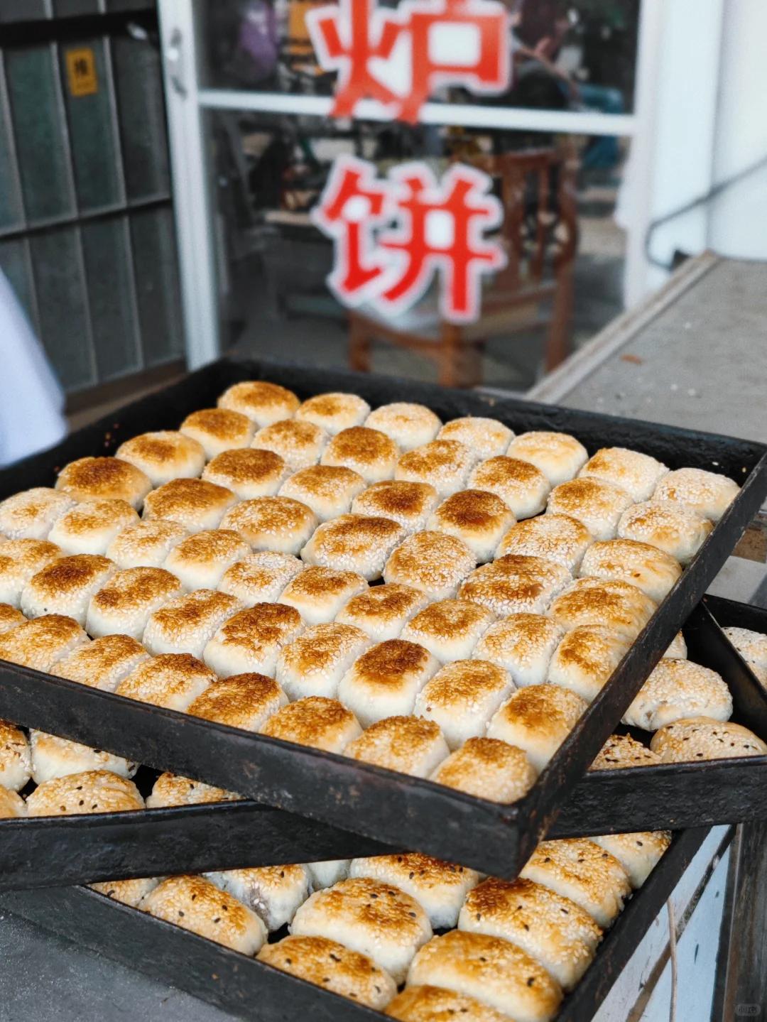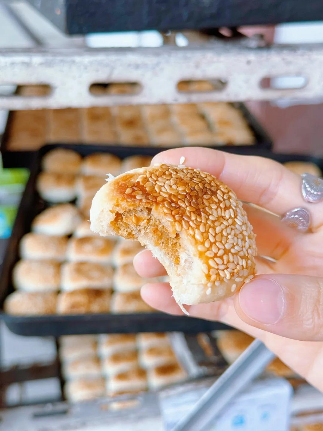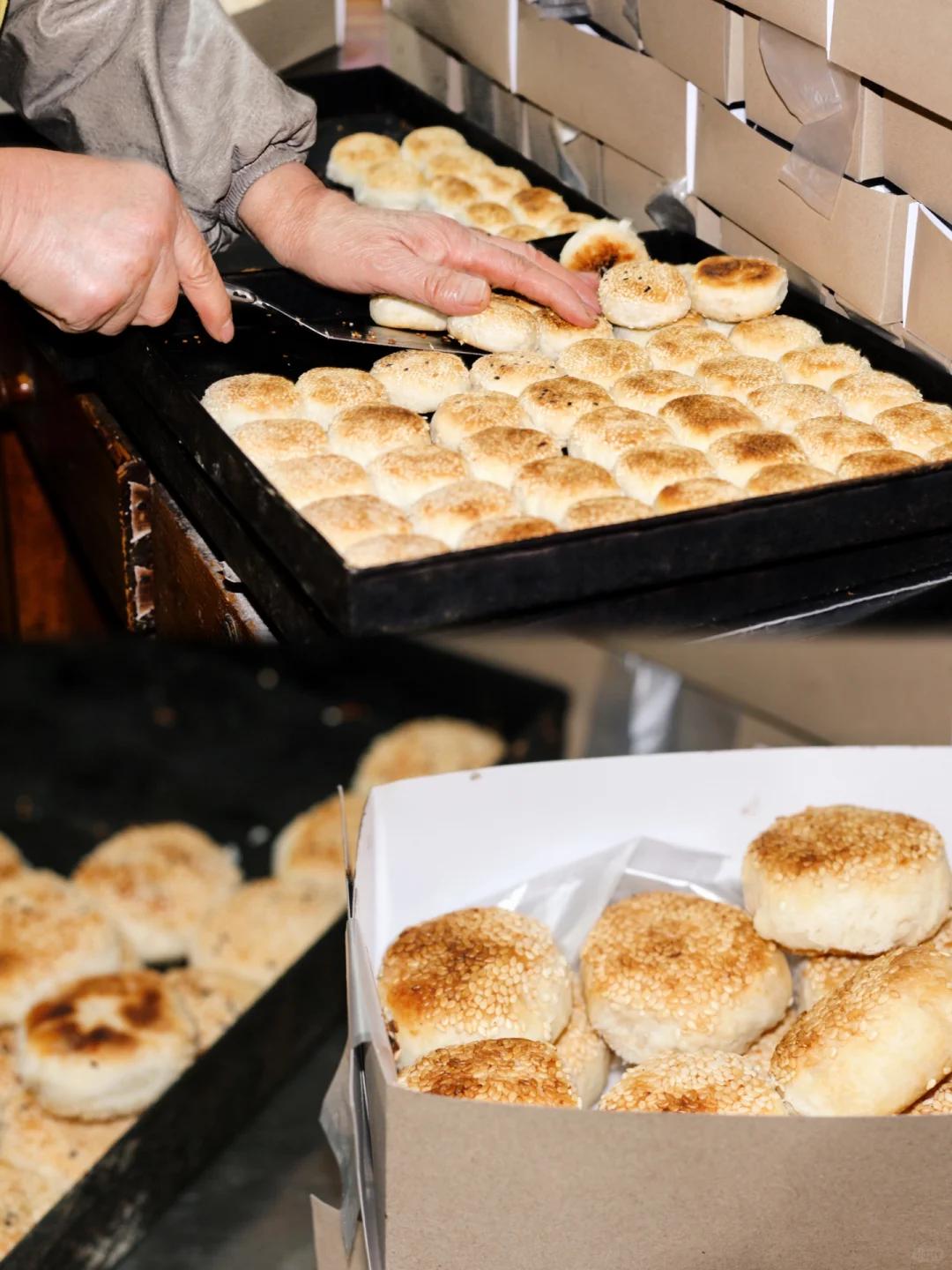咬上一口,饼皮和苏州蟹壳黄类似。但大炉烧饼入炉前,会用竹片压平,所以吃起来是层层叠叠的绵密酥脆,油酥感更强烈。