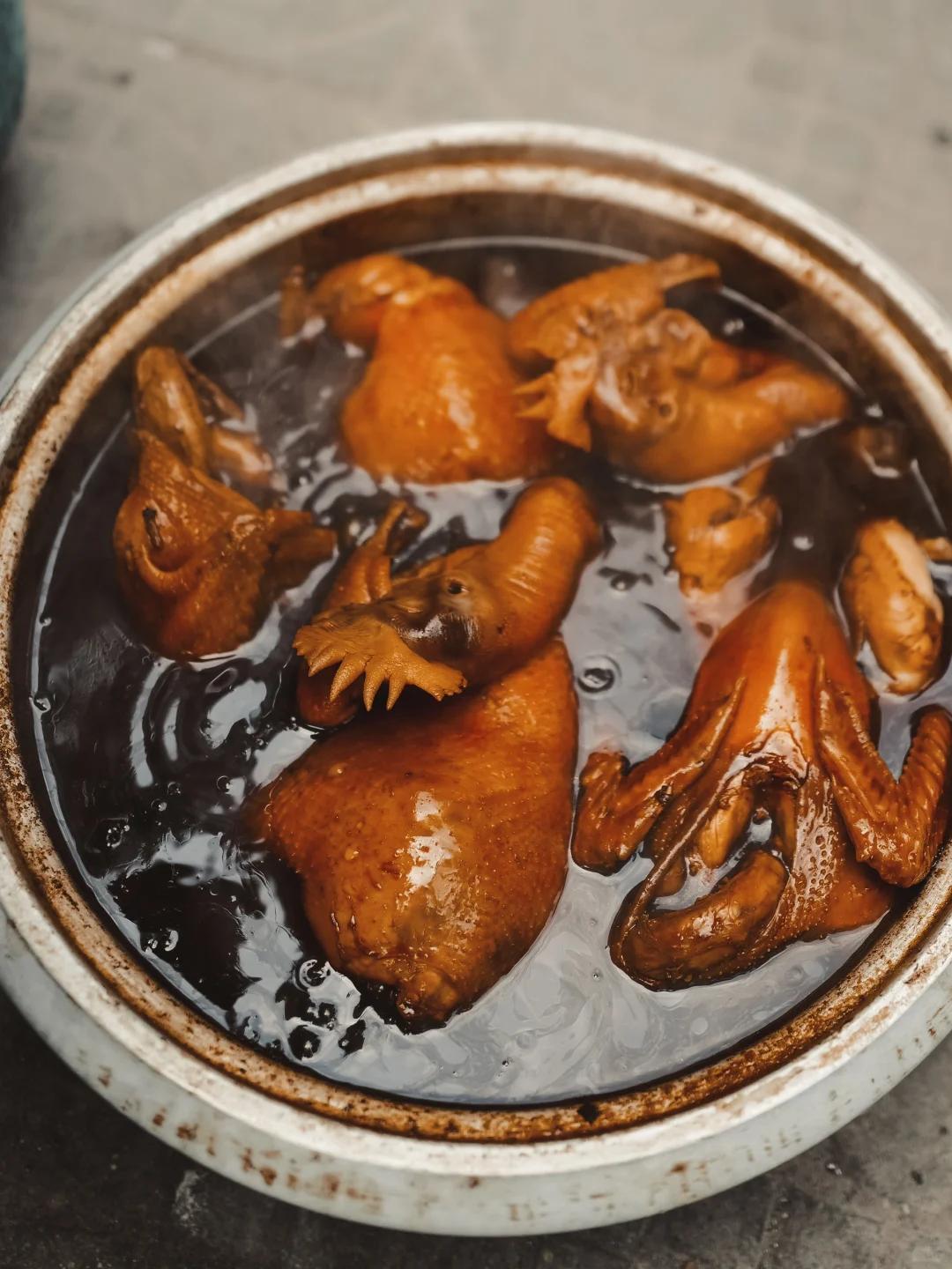制作过程非常讲究,选用一年生以上的草鸡,用特殊秘方熬制成卤汁。卤汁由数十种调料配制而成,其中秘制的老汁是这道菜的灵魂。