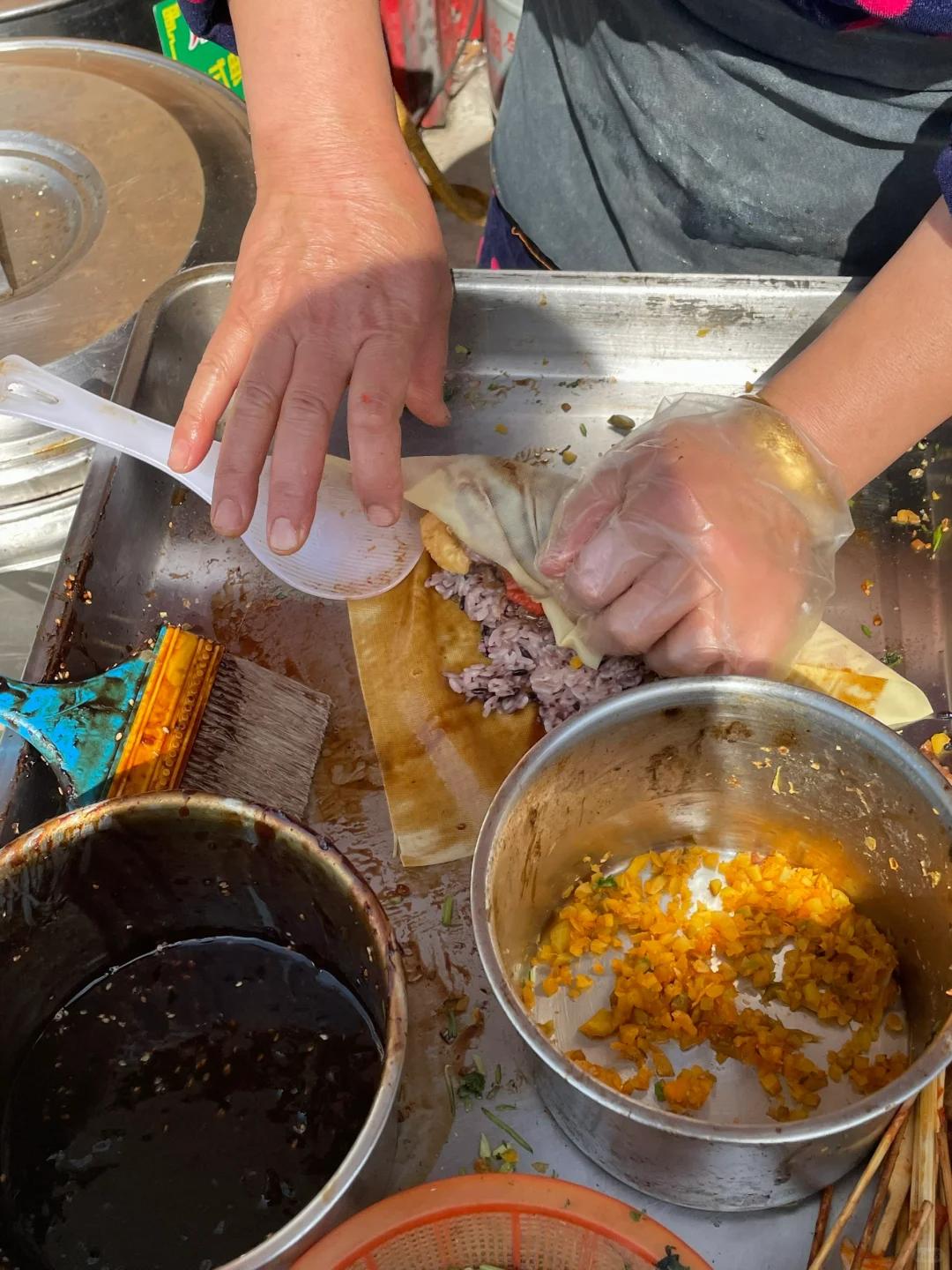 百叶皮上涂上了酱汁在放上各种小料!糯叽叽和香脆口感的交替融合,十分的好吃,更带来了一份淡淡的甜味。