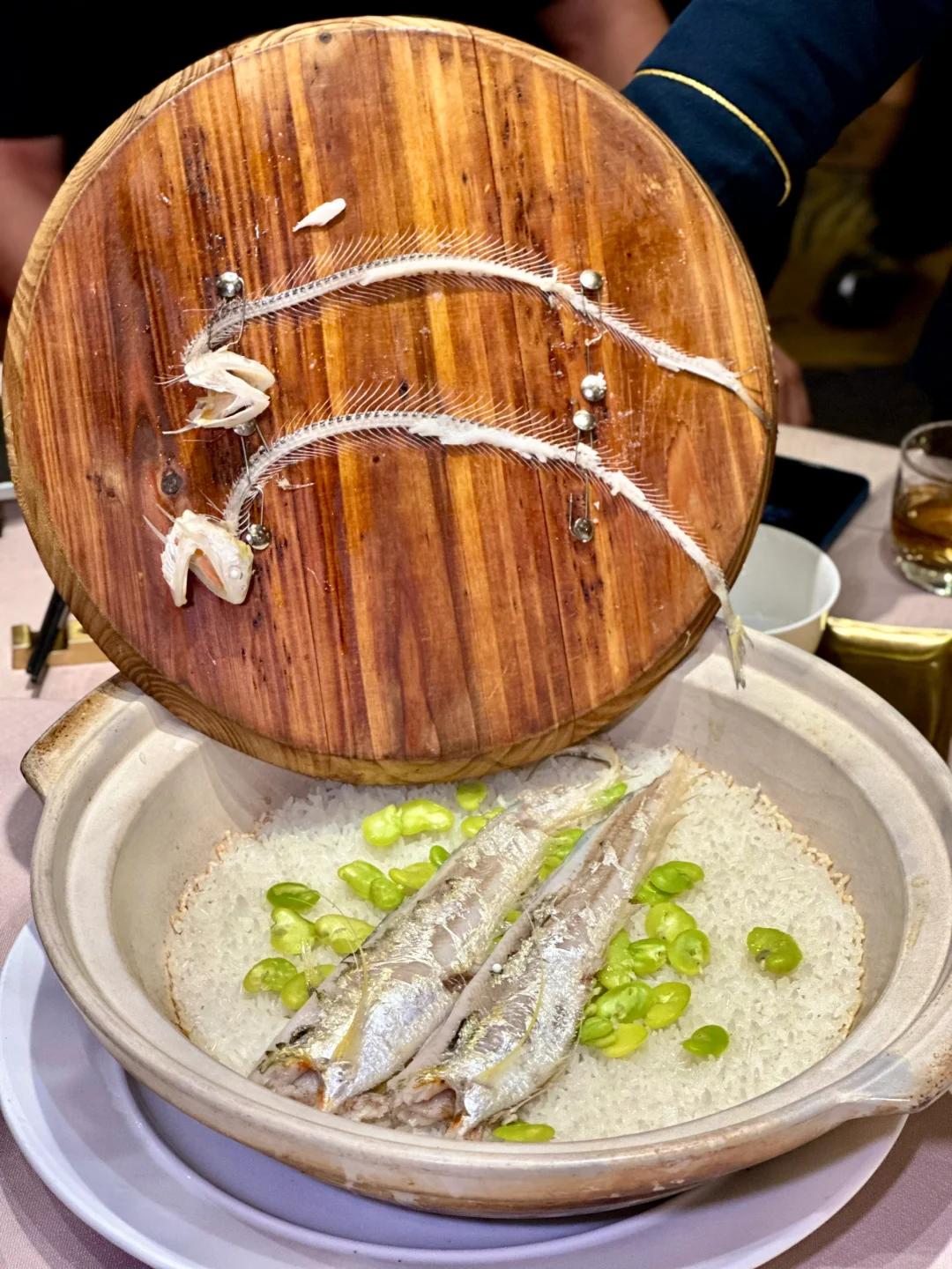 在靖江最常吃的就是刀鱼饭。把刀鱼钉在锅盖上,等到熟了之后,鱼肉会自动的掉入碗里面。