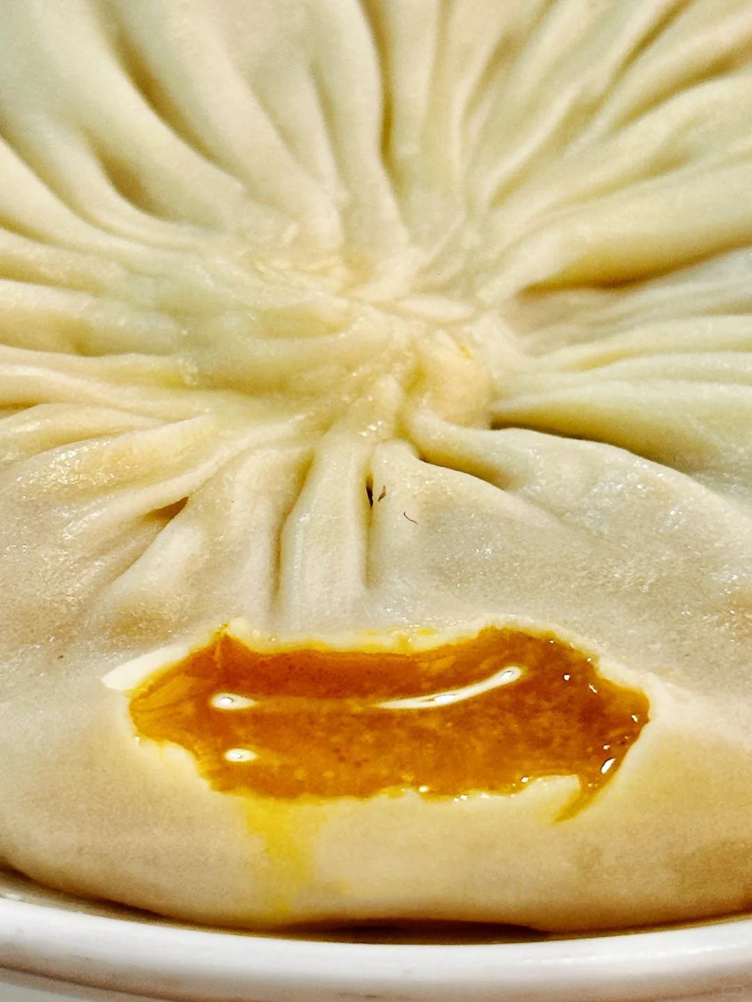 正宗蟹黄汤包只有蟹黄和蟹肉,面皮特别的薄,里面都是丰盈的蟹肉和汤汁,夹在筷子上,像灯笼一样。
