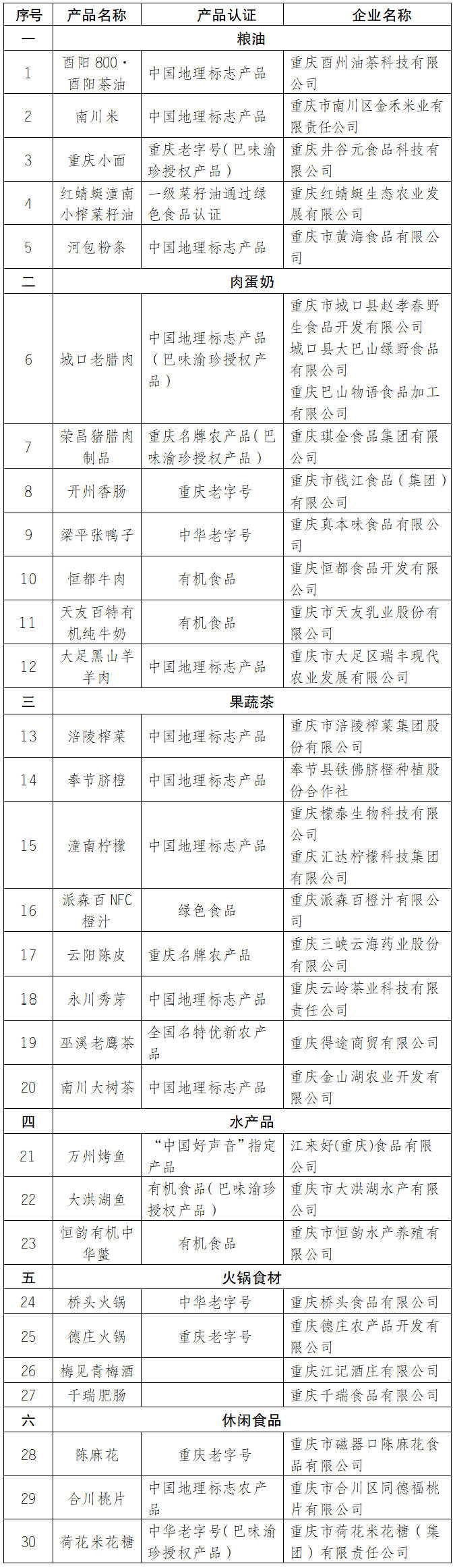 这30款精品伴手礼涵盖粮油、肉蛋奶、果蔬茶、水产品、火锅食材、休闲食品六个大类。