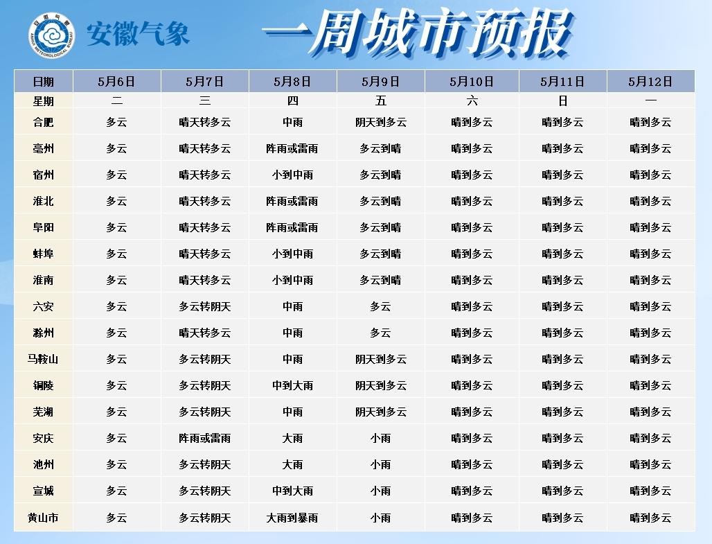 据安徽气象台预报,5月8日前后淮河以南有一次降水过程,其中8日大别山区和沿江江南部分地区大雨到暴雨。13-15日受冷空气影响安徽省还有一次降水过程。其余时段全省以晴到多云天气为主。