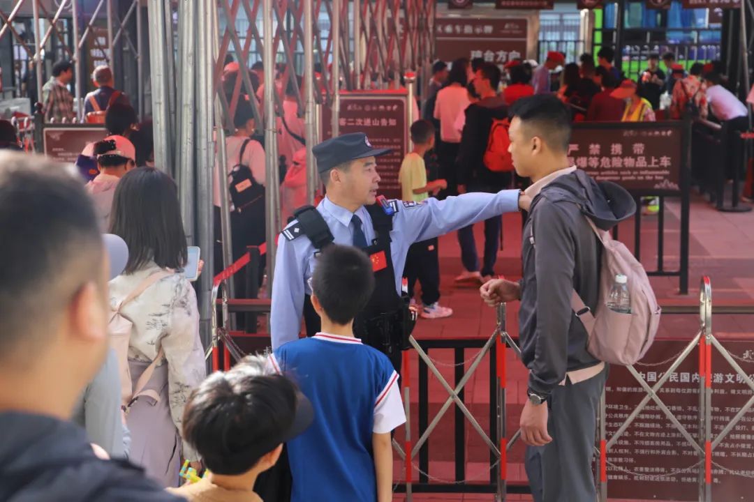 “五一”假期,十堰市公安局武当山分局根据人流量及景区特点,每人部署150名警力,定人定岗定责开展勤务,定时定点开展空地巡防,形成立体化全面守护,让群众真切感受到“人在景中游,警在身边守”。