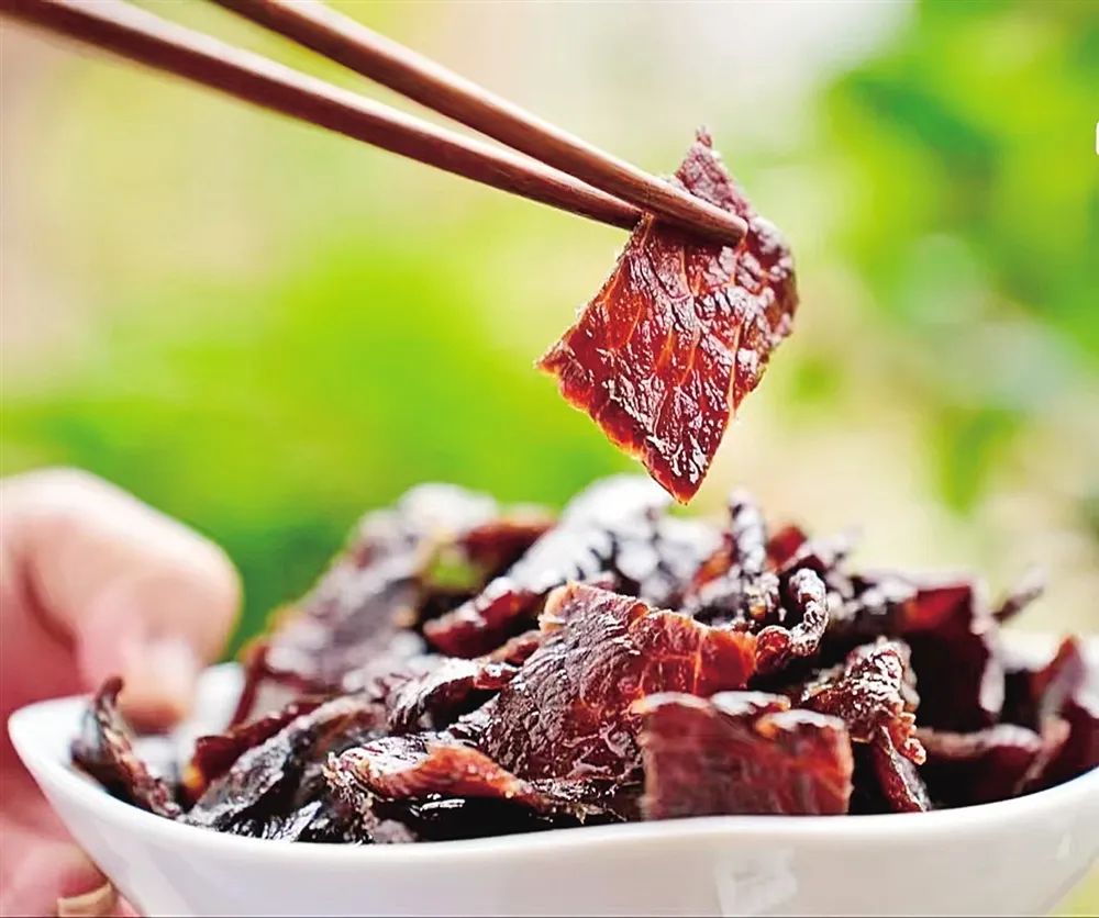 先说牛巴。玉林牛巴是全国有名的玉林特产,它选材苛刻,经过腌制、烘烤、油炸、煮焖等七道工序制作而成。早在2008年,就被列为玉林市第一批非物质文化遗产。2011年,玉林牛巴获批为中国国家地理标志产品。2021年1月,再次殊荣加身,入列第八批自治区级非物质文化遗产名录。