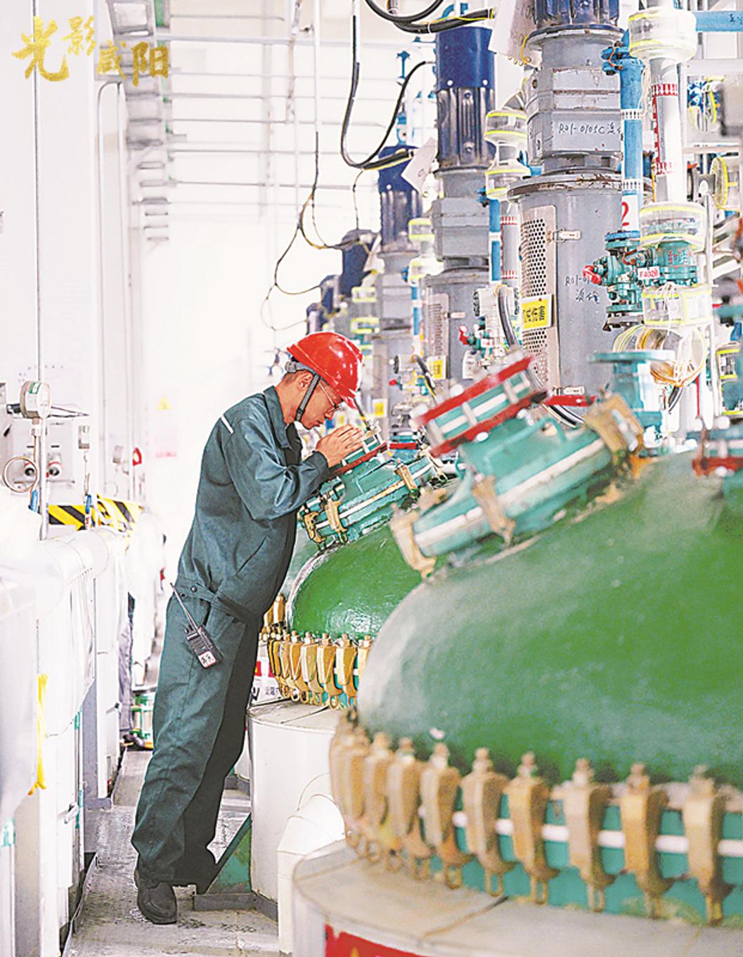 思科赛科技新材料暨药品中间体项目,工人在查看设备运行情况。