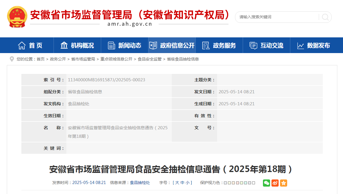 安徽省市场监督管理局食品安全抽检信息通告(2025年第18期)