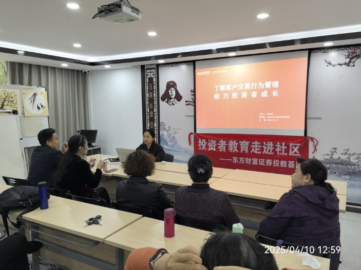 2025年04月10日东方财富证券投资者教育基地走进江苏省扬州市广陵区曲江街道顾庄社区,开展了以“了解客户交易行为管理,助力投资者成长”为主题的投教活动,活动共计50名(现场32人、线上18人)社区居民参与。