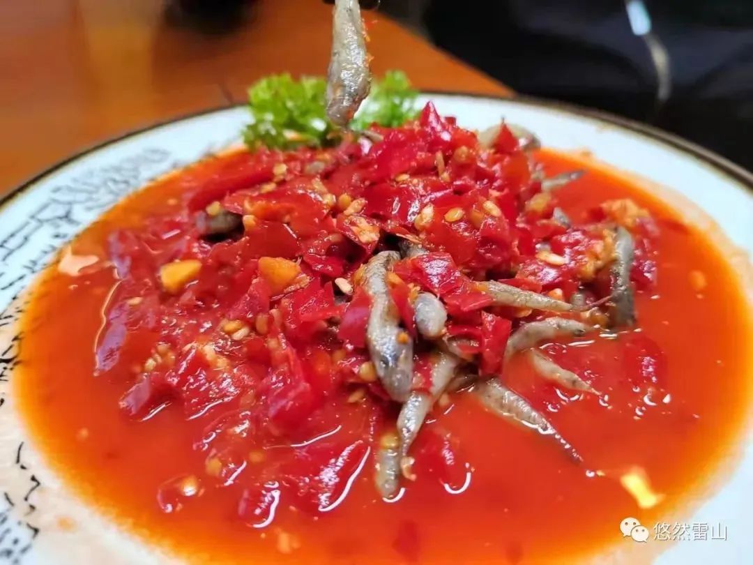 鱼酱酸是黔东南「雷山县」的限定美味。以红辣椒和新鲜小河鱼为主药原料,制作工艺也十分讲究。辣椒加上生姜和木姜子,打碎后和小河鱼混合,一起放入坛中。鱼酱慢慢发酵,沉淀出不可复制的美味。