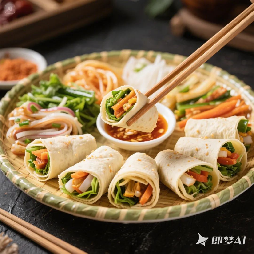 丝娃娃的魅力在于其丰富的食材组合与独特的吃法。薄如蝉翼的面皮,包上折耳根、胡萝卜丝、海带丝、黄瓜丝、芹菜、脆哨等20多种配菜,再浇上一勺调配好的汤汁,一口咬下去,口感丰富。