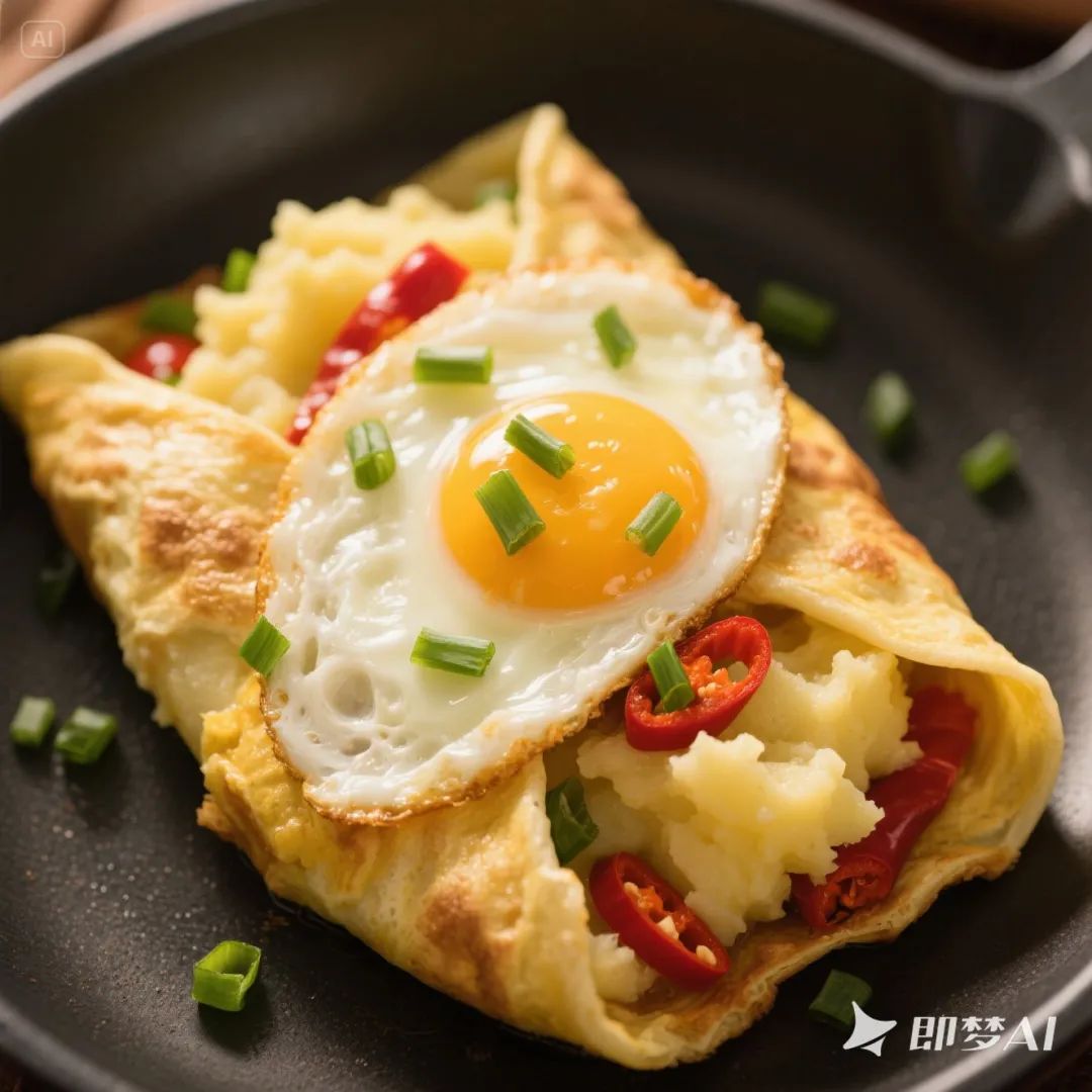 将煮熟的洋芋剁碎,加入折耳根、火腿肠、酸萝卜等配菜一起翻炒,再裹入蛋皮内,洋芋泥和鸡蛋的香气交织在一起,一口下去别提有多过瘾。