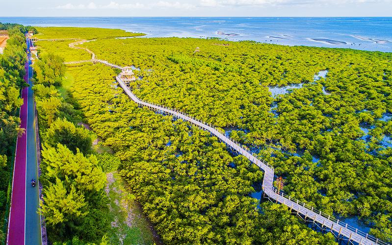 金海湾红树林生态旅游区毗邻北海银滩,是一处集红树林湿地、滨海生态和疍家文化于一体的国家级生态旅游区。这里拥有3000多亩郁郁葱葱的红树林,栖息着白鹭等众多珍稀鸟类,退潮时还可体验赶海乐趣,挖螺拾贝,感受滩涂生态的奇妙。景区内木栈道蜿蜒,可近距离观赏红树林奇观,还能领略疍家民俗风情,是生态旅游与休闲度假的绝佳去处。