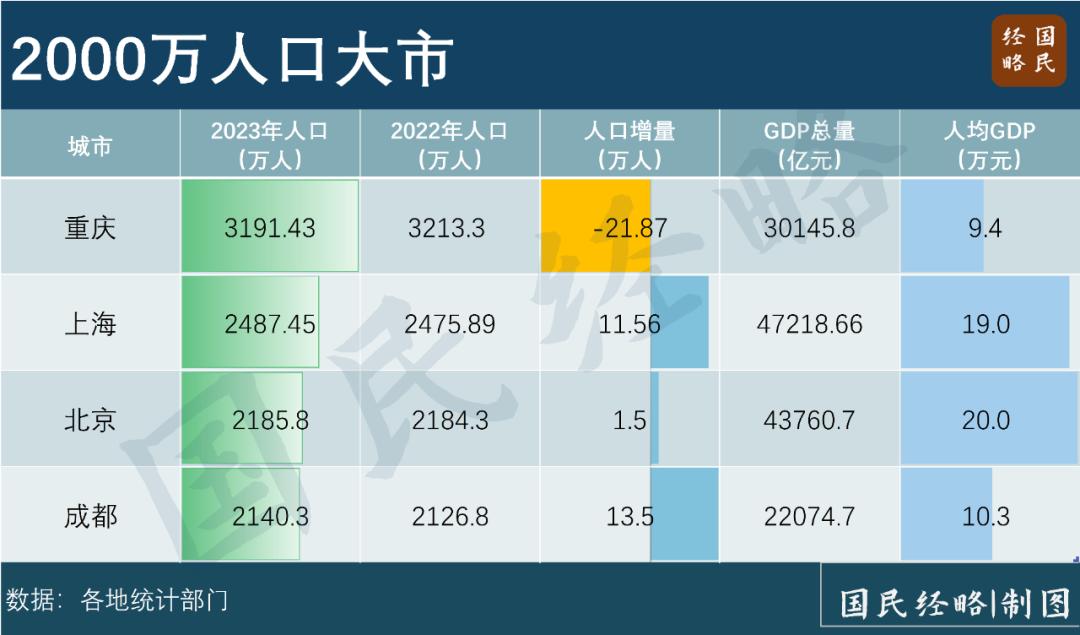 更受瞩目的则是全国人口第三城之争——2023年,成都人口达2140.3万人,而北京为2185.8万人。两地的人口差距从高峰时期的500多万人,收窄到45.5万人。