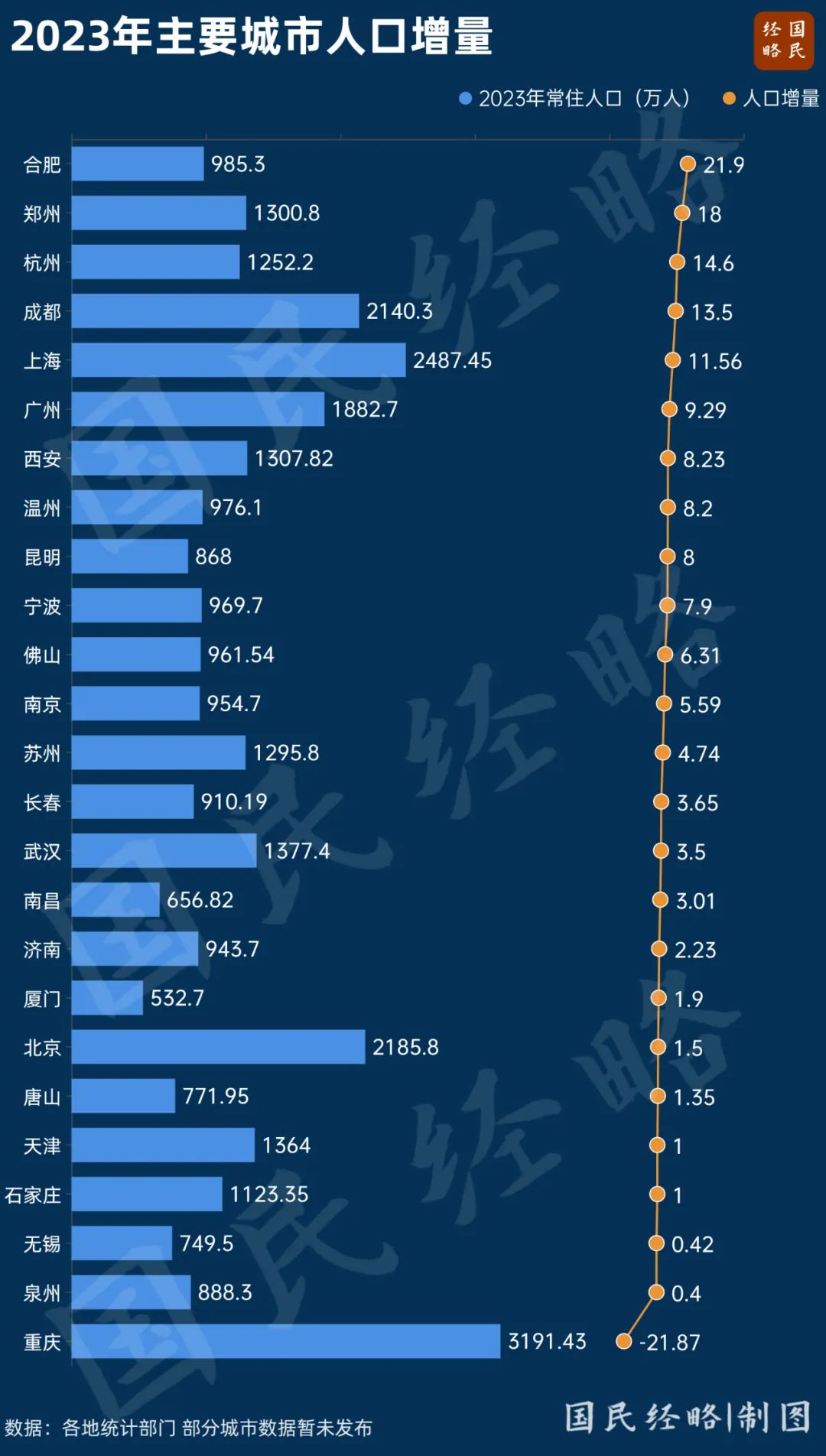 在已公布人口数据的城市中,合肥、郑州、杭州、成都、上海人口增长超过10万人,除了上海之外都是省会。