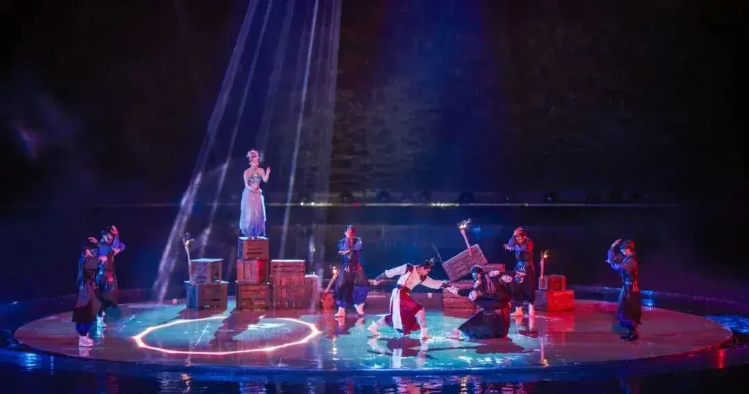 360°全景秀《海上有青岛》,以“讲好青岛故事”为核心,以独特的海上景观和世界首创的巨型水上机械舞台为背景,动态舞美与水面机械系统联动,沉浸式观演,共赴一场山海奇妙夜。