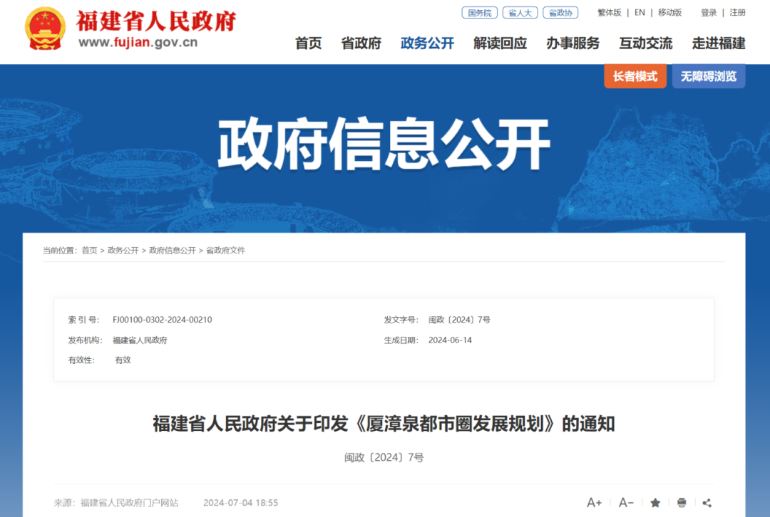 7月4日,福建省人民政府发布关于印发《厦漳泉都市圈发展规划》的通知。当中提到,厦漳泉都市圈包含厦门、漳州、泉州三个设区市除华安县、永春县、德化县以外的区域,陆域国土面积2.03万平方公里、占全省的16%,海岸线1242公里、占全省的34%,2023年末常住人口约1838.9万人、占全省的44%。