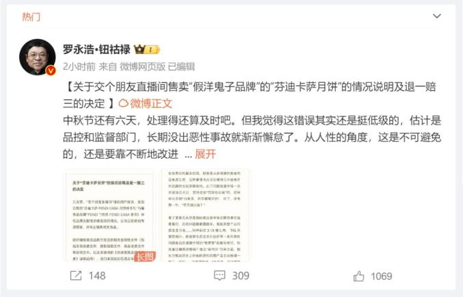 9月11日,“交个朋友”直播间官方微博发布公告称,接到用户投诉,发现已售的“芬迪卡萨月饼伴手礼”与奢侈品品牌“FENDI”存在品牌关联性涉嫌造假的情况。公司立即启动专项调查,并停止销售相关商品。罗永浩也发文回应:错误其实还是挺低级的。我们向消费者诚挚致歉,退一赔三的钱款大概会在十个工作日内自动到账。