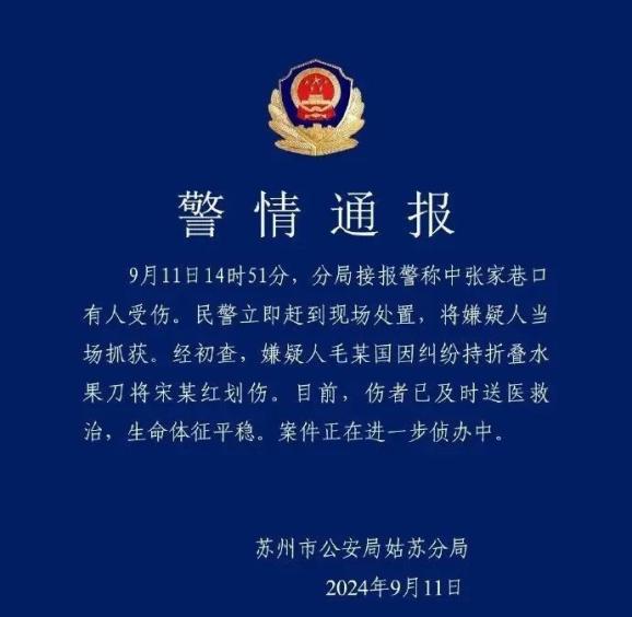 9月11日,不少网友在社交媒体上发布视频,称江苏省苏州市平江路有一男子持刀捅伤一女子。当日下午,苏州市公安局姑苏分局发布通报称,嫌疑人被当场抓获,伤者已及时送医救治。详情: