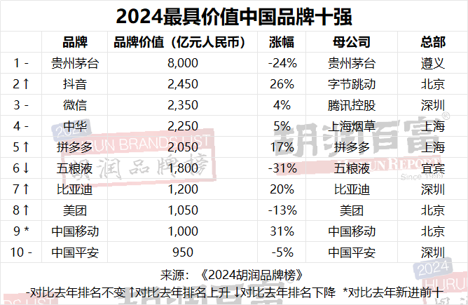 胡润研究院4月16日发布《2024胡润品牌榜》,300强品牌来自中国64个城市。贵州茅台连续第七次成为“最具价值中国品牌”;抖音品牌价值增长500亿元,达到2450亿元,排名上升至第二;微信品牌价值增长4%至2350亿元,稳居第三名;拼多多品牌价值增加300亿元到2050亿元,首次跻身前五强。