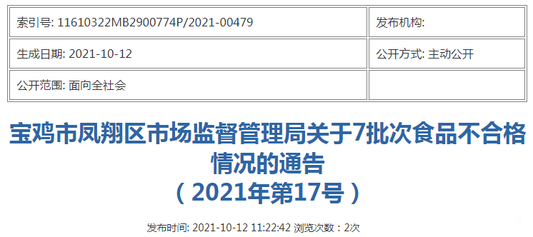 中国质量新闻网讯 近日,陕西省宝鸡市凤翔区市场监督管理局发布关于7批次食品不合格情况的通告(2021年第17号)。