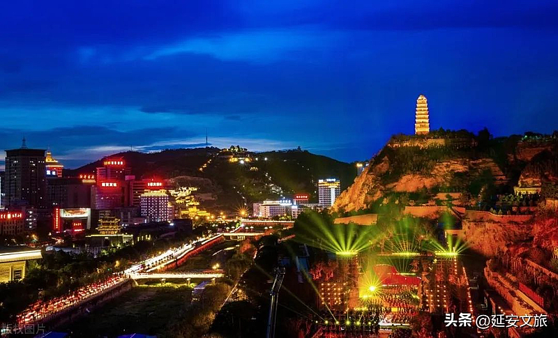 【清凉山夜景】是中共中央新闻事业的发祥地,是中央印刷厂、纸币厂、新华书店等革命文物旧址所在地,被称为红色延安的“新闻山”。“试问九州谁做主,万众瞩目清凉山”,它为中国革命做出了不可磨灭的功绩。观看宝塔山灯光秀:在一阵悠扬的音乐声中,突然,“黄河之水”咆哮着,奔腾着,怒吼着从天上来了!宝塔下的半座山体顿时如同“源出昆仑衍大流 玉关九转一壶收”的黄河水铺满了秦晋大峡谷中的十里龙漕,风在吼马在叫,黄河在咆哮”的经典乐声响起来了!