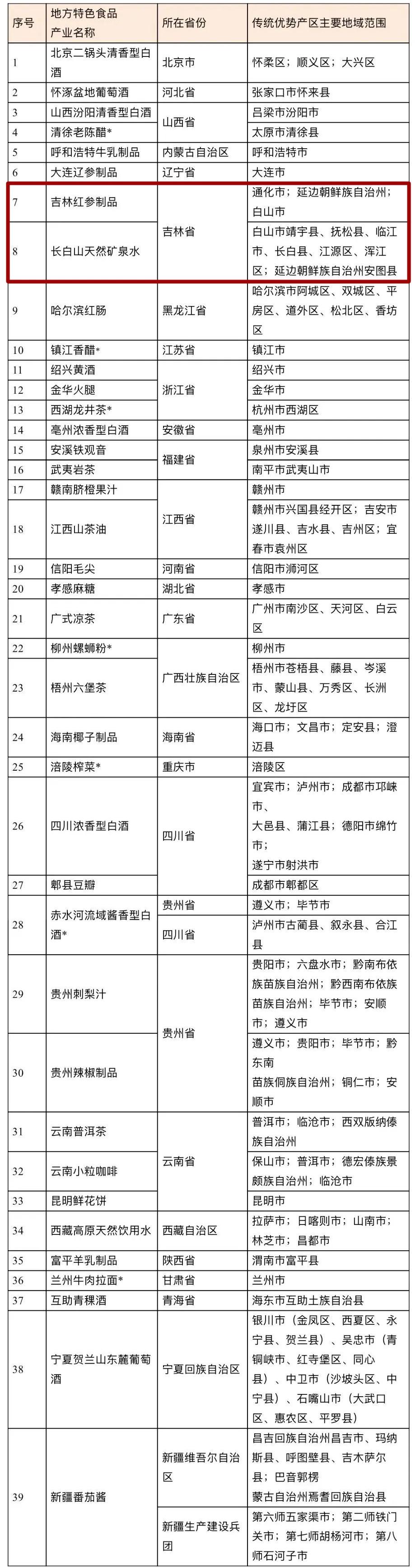 今天(4日),我国发布首批传统优势食品产区和地方特色食品产业重点培育名单,包括吉林红参制品、长白山天然矿泉水等39个重点培育对象。