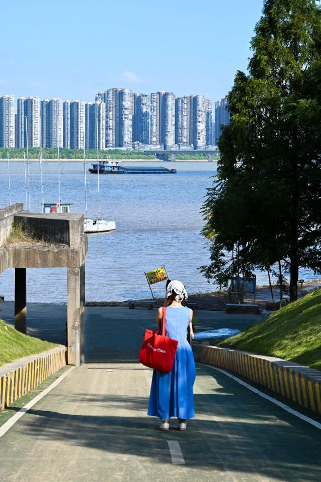 网友说导航中国石化长沙城发加油站,有一个长长的下坡,走到江边就能看到。就是这个坡+水域,就变得格外出片,相当于坐地铁到威海了。