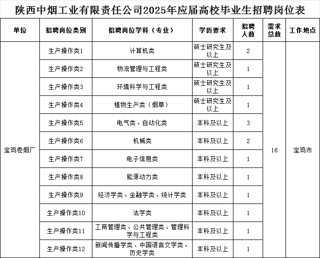 2025年陕西中烟工业有限责任公司招聘公告已发布,全省招聘96人,其中,宝鸡卷烟厂招聘16人。报名时间:2025年3月19日9:00至3月25日17:00。报名方式:应聘者登录网址进行报名。应聘者只能选择一个单位的一个专业岗位报名,否则将取消应聘资格。