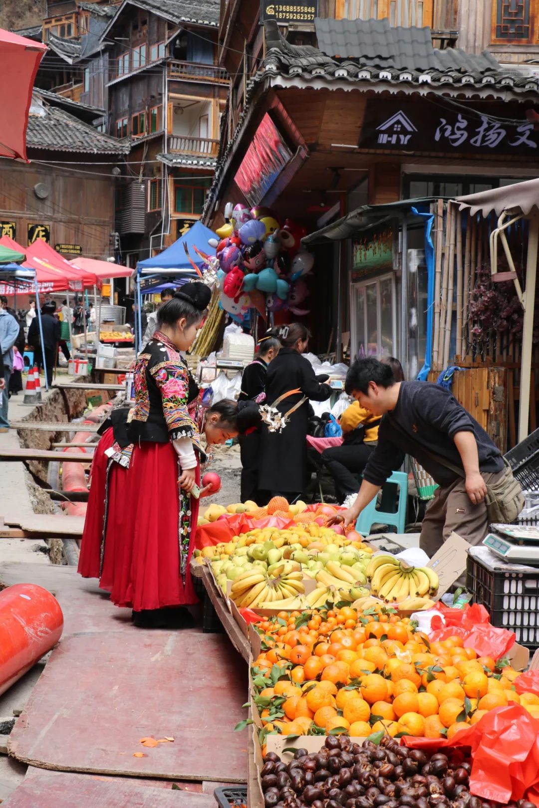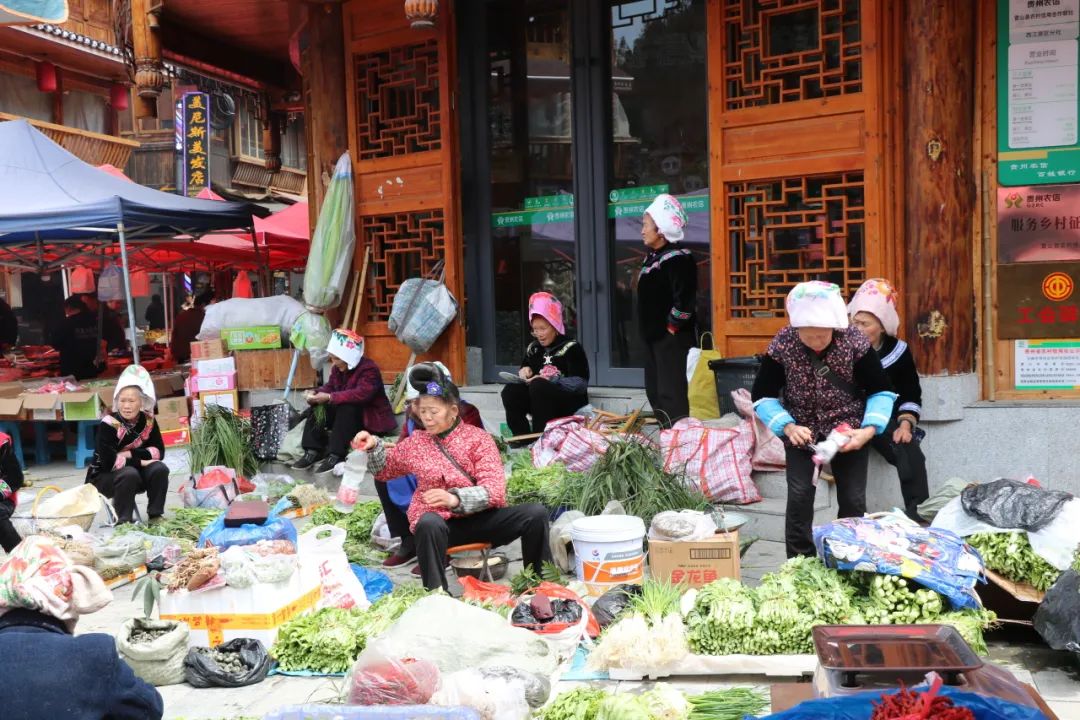 苗寨赶集时间按照12生肖计日,每逢马日和猪日就是赶大集的日子。规模不算大,都是本地人在售卖。有自家种植的蔬菜,自酿米酒、辣椒酱……