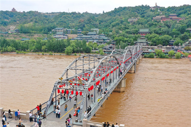 4月26日,游客在位于兰州市城关区的兰州黄河铁桥中山桥参观游览。新华每日电讯记者 范培珅 摄