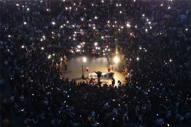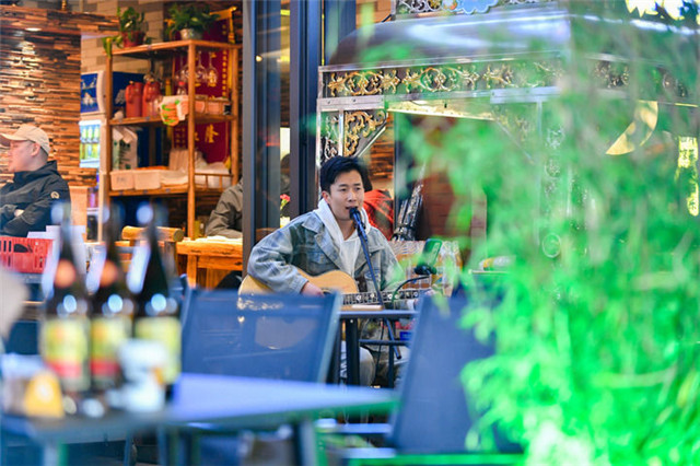 4月28日,音乐爱好者在兰州市城关区正宁路小吃夜市弹唱歌曲。新华每日电讯记者 郎兵兵 摄
