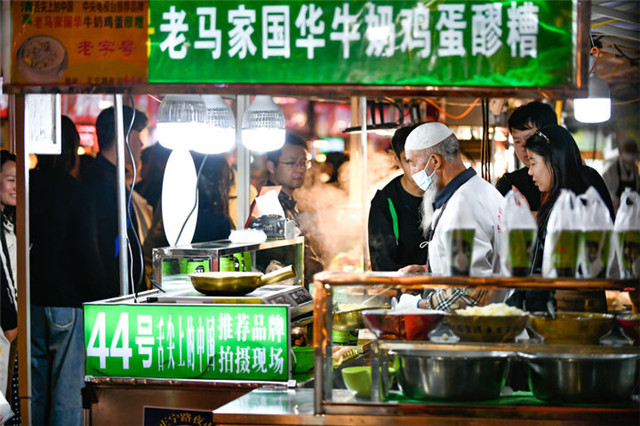 4月28日,游客在兰州市城关区大众巷新光夜市购买特色美食牛奶鸡蛋醪糟。新华每日电讯记者 郎兵兵 摄