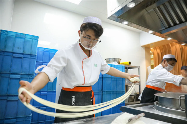 9月8日,在兰州市城关区一家牛肉面馆,师傅在拉面。新华每日电讯记者 郎兵兵 摄