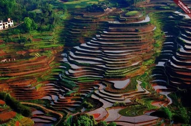 同样,这也是一片鲜为人知的梯田。春夏之交,这里蓄水充盈,层层叠叠的水田倒影着蓝天白云、飞鸟惊雀,美不胜收。