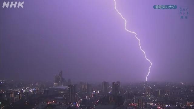 放電(ほうでん)は、空でも起きます。雲の中では、大小さまざまな氷のつぶがぶつかりあって静電気(せいでんき)が起きます。雲にたまったマイナスの静電気が、地面のプラスの静電気と引き合って放電が起きるのです。ピカッ、ゴロゴロッ! 雷(かみなり)を見ながら、「こわくないよ」とネコをなでていると…「パチッ!」。「いたっ!」。