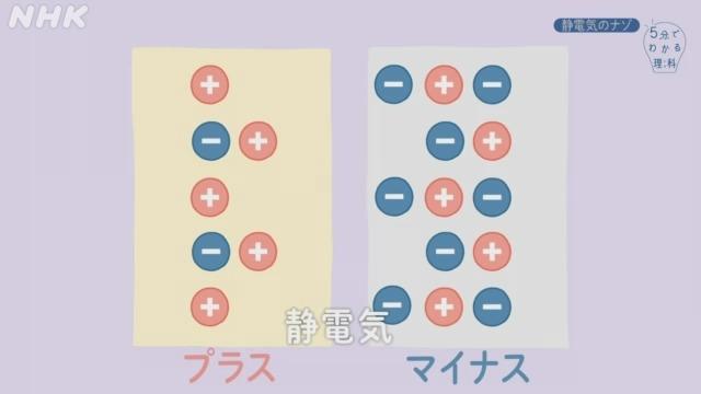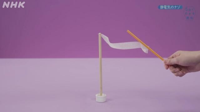 ものの中では、プラスとマイナスが電気的(てき)につりあっています。ものをこすると、マイナスの電気が一方に移動(いどう)し、プラスが多いものと、マイナスが多いものに分かれます。プラス、マイナスにかたよってとどまるのが、静電気(せいでんき)です。静電気が起きるとどうなるのでしょう。ストローを布(ぬの)でこすると、マイナスの静電気が起きます。一本を固定(こてい)し、もう一本を近づけると…。にげていきます。マイナスの静電気どうしは、しりぞけあうのです。