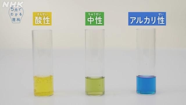 水の色をかえたのは、BTB溶液(ようえき)。色の変化(へんか)で液体の性質(せいしつ)を教えてくれます。たとえば、炭酸水(たんさんすい)に入れると黄色にかわります。これは、酸性(さんせい)。スーッとする虫さされの薬は、青色になりました。アルカリ性です。食塩水(しょくえんすい)は、緑色に。中性です。酸性、中性、アルカリ性。3つの色が、3つの性質をしめしています。黄色がこいほど酸性の度合いが強く、青がこいほどアルカリ性の度合いが強い。そのあいだが中性です。