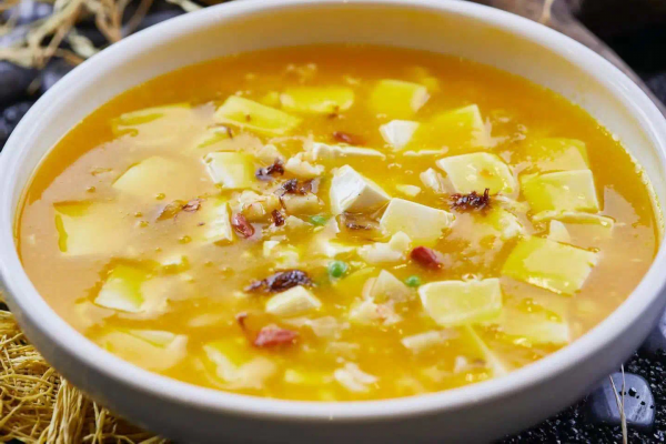 蟹黄汪豆腐是泰州常见的一种家常美食。洁白的豆腐、光滑的龙香芋、碧绿的青蒜花,配上油汪汪的蟹黄,腴香糯滑,色泽亮丽,偶尔加点咸鸭蛋或猪油渣,口感就会有质的提升。一口下去,嫩白的豆腐配上澄黄的蟹肉,鲜香爽滑的口感,咸中带鲜,别有一番风味。