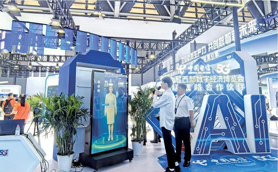 6月19日,在第六届西部数字经济博览会上,参会者和屏幕上的数字人对话。