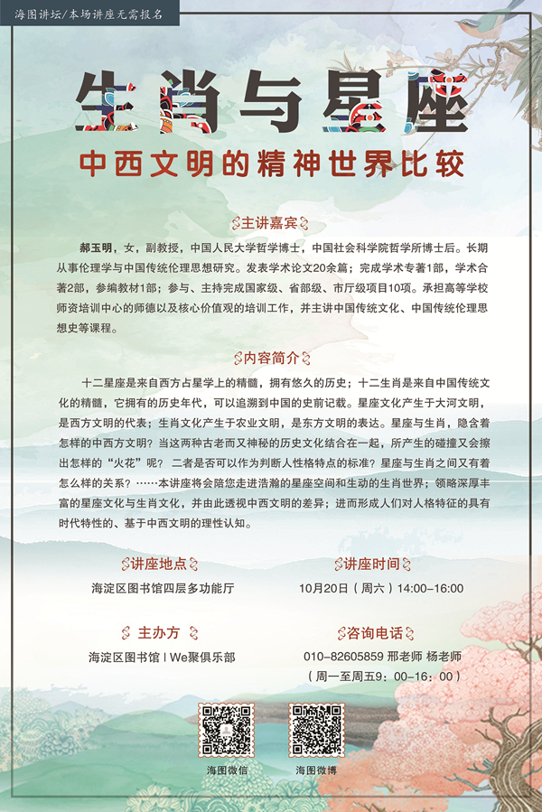 本讲座将会陪您走进浩瀚的星座空间和生动的生肖世界,领略深厚丰富的星座文化与生肖文化,并由此透视中西文明的差异,进而形成人们对人格特征的具有时代特性的、基于中西文明的理性认知。