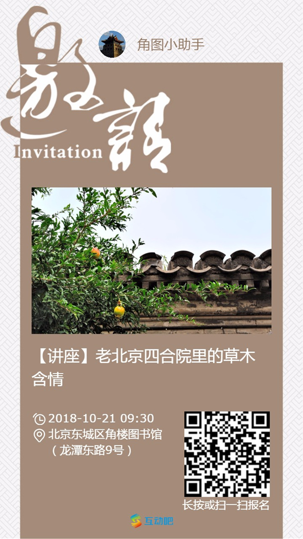 本周,李卫伟老师将作客角图,跟您聊聊老北京四合院里的一草一木,让我们一起在古老的院落中,感受中国式的诗意生活。