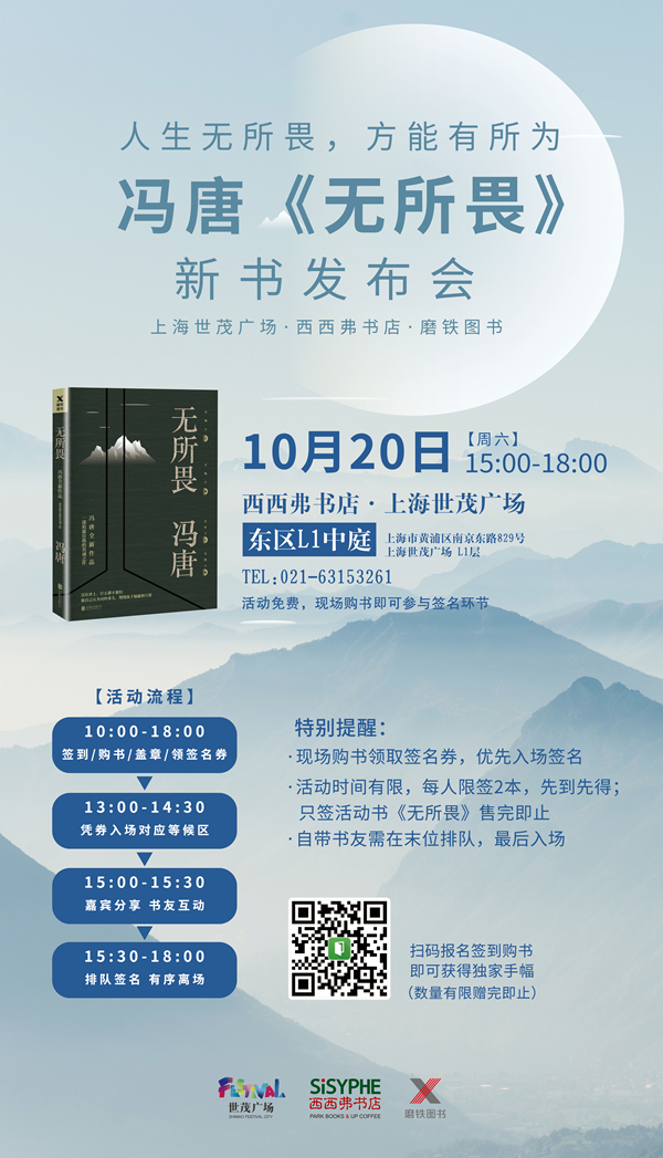 《无所畏》,冯唐全新作品,一部坦露自我的真诚之作。全书分为如何获得成功、爱情如何对抗时间、生活怎么过才算有意义、自我价值如何体现四个部分,并收录《如何避免成为一个油腻的中年猥琐男》、《找个好看的扑倒》、《爱情如何对抗时间》、《我爸认识所有的鱼》等知名篇目。本次活动,冯唐将和读者分享《无所畏》中谈及的人、事、物。