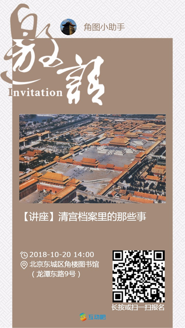 本周,中国第一历史档案馆的高换婷老师作客角图,以清代档案为史实依据,以介绍档案原件(照片)为切入点,为您讲述清代传位册封、帝王生活、娱乐巡游、后宫选秀等遗闻轶事,借一件件的档案,为您呈现清代皇宫里一个个历史真相。